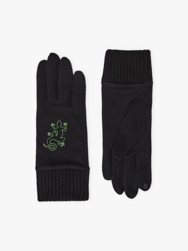 – Detail: 2 embroidered lizards on each hand and one neon green lizard on front