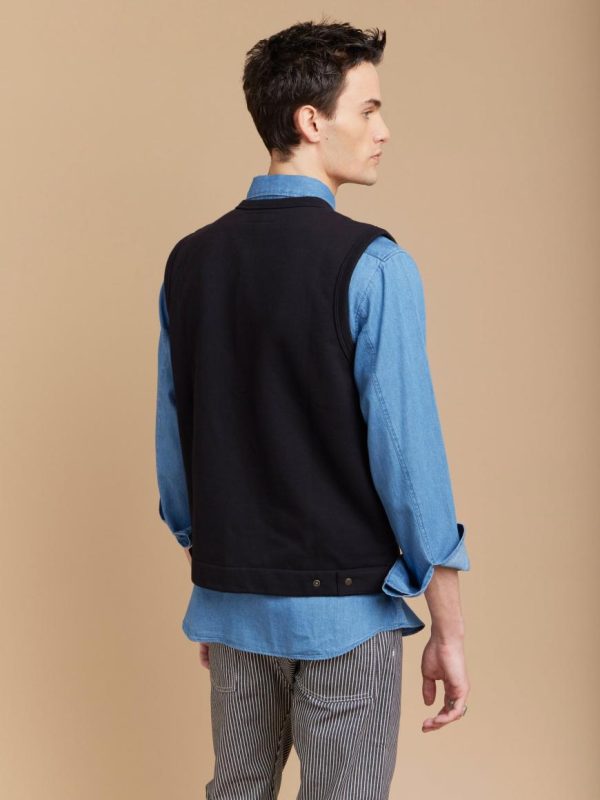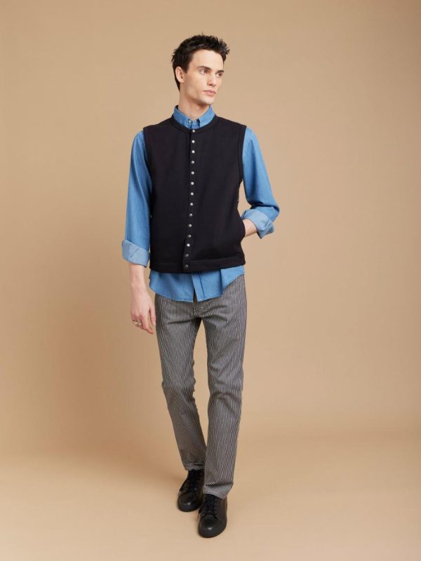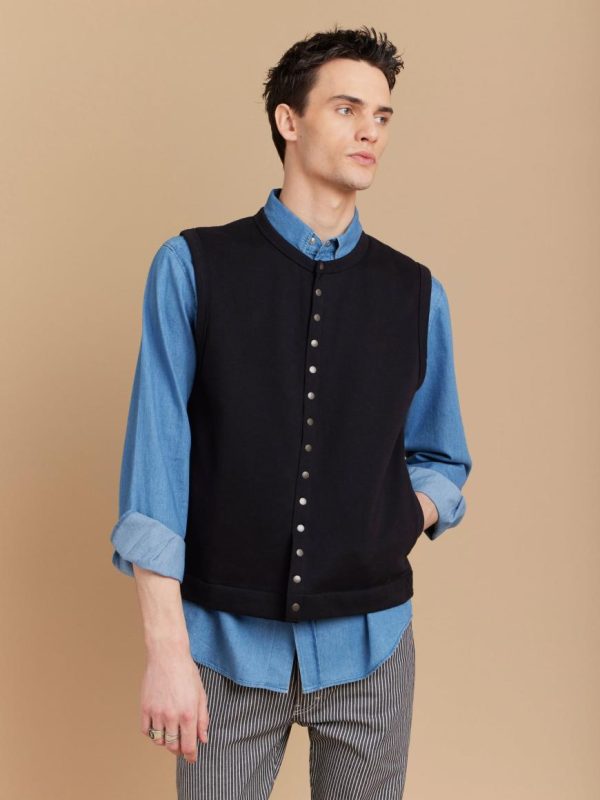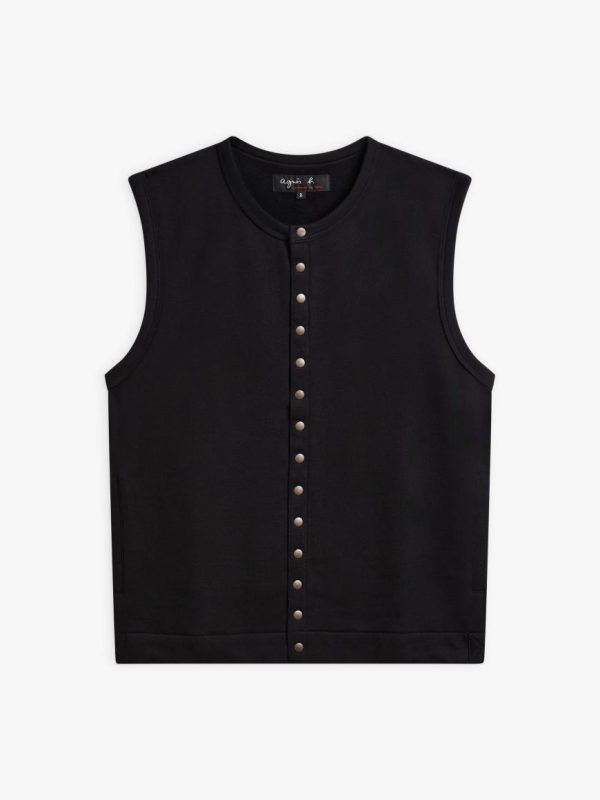Azur sleeveless cotton fleece cardigan. The snap cardigan was created by agnès b. in 1979. It was an immediate success and agnès b. continues to develop it each year.