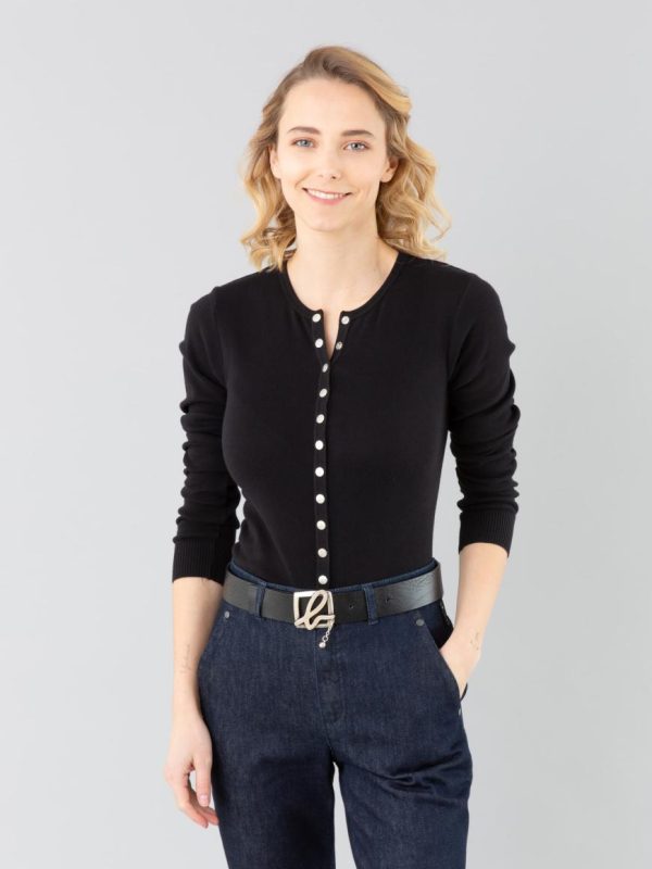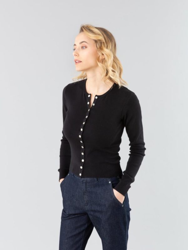 The “Swing” snap cardigan has a fitted cut and snap buttons in silver-toned metal engraved with “b.”