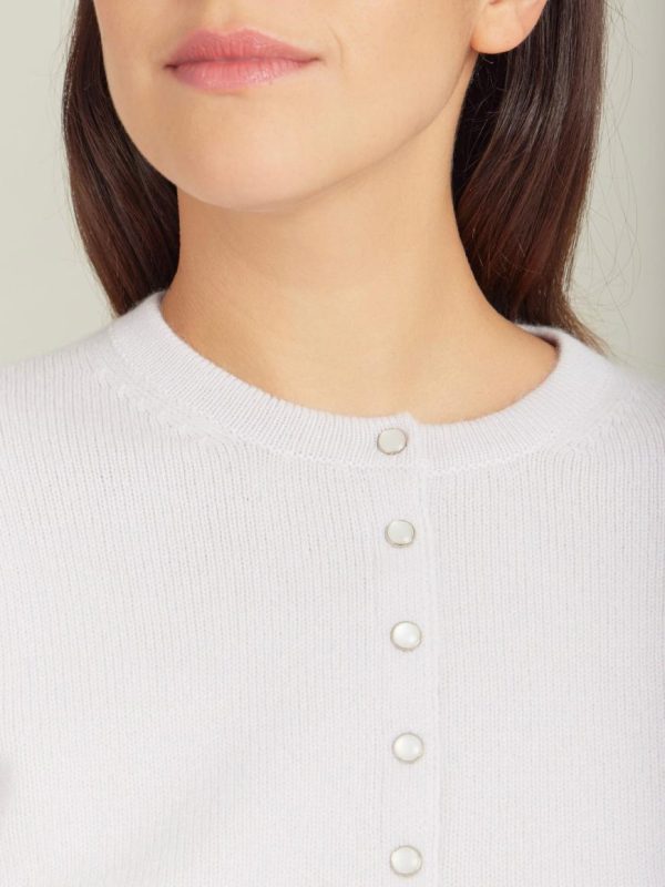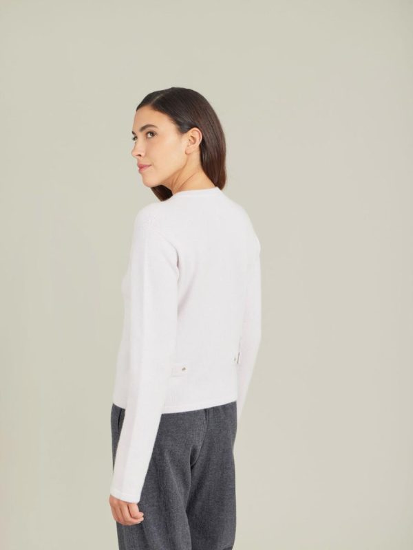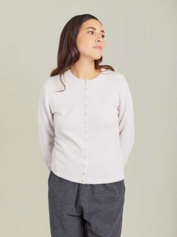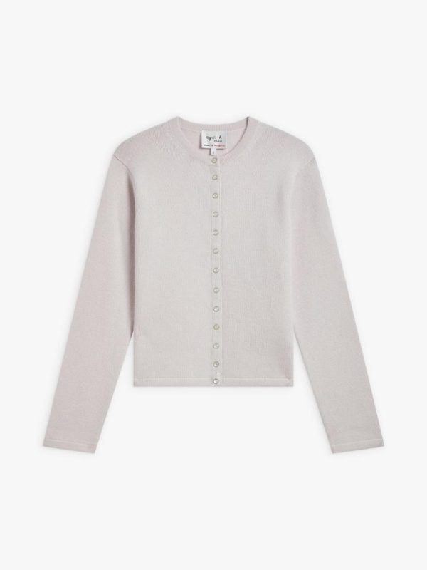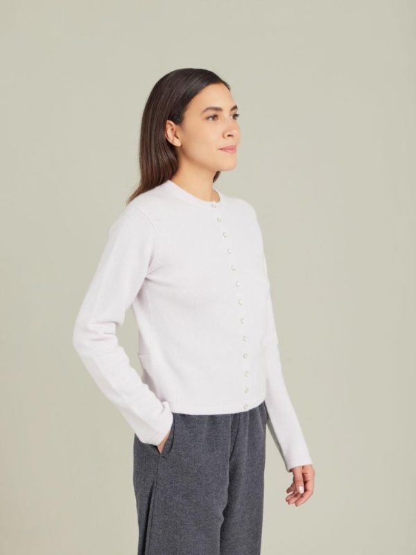 The women’s “12 ans” snap cardigan is a cropped, fitted style. This winter, it is available in 100% Mongolian cashmere, an incomparably soft and lightweight, noble material.