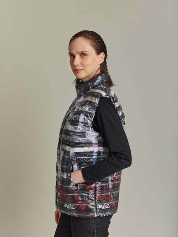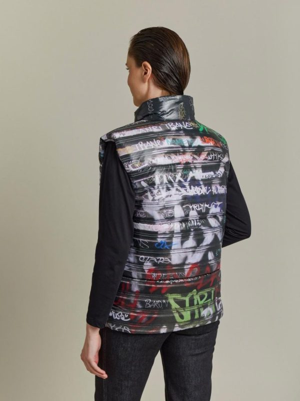 Polyester down jacket with digital print “Rideau de fer” (Iron curtain), photo by agnès b.