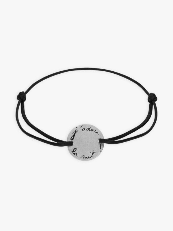 Bracelet with adjustable cord and silver-plated brass charms. Engraved with “j’adore la nuit” (i love the night). Made in Madagascar.
