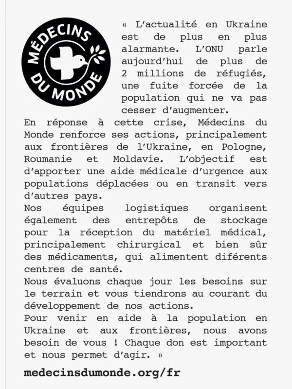 Profits from the sales of this badge are for the benefit of Médecins du Monde, present in the field for several years in Ukraine and currently on the Polish and Moldovan borders for essential material and medical support.