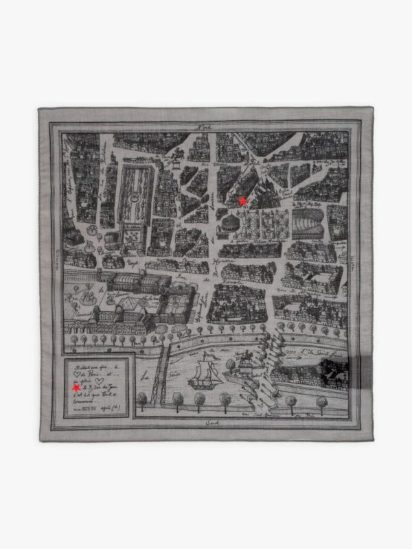 This scarf depicts a map of central Paris, designed by Adrien Beau and agnes b. The very first agnes b boutique opened in 1976 at 3 rue du jour, indicated by the red star.