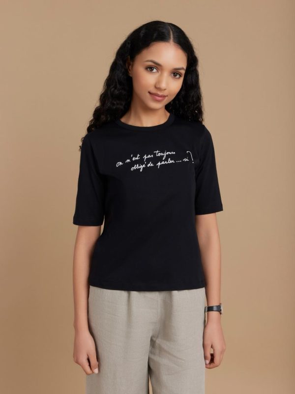 Brando cotton t-shirt with elbow-length sleeves and “on est pas toujours obligé de parler… si ?” (“we don’t always have to talk… do we?”) screen-print.