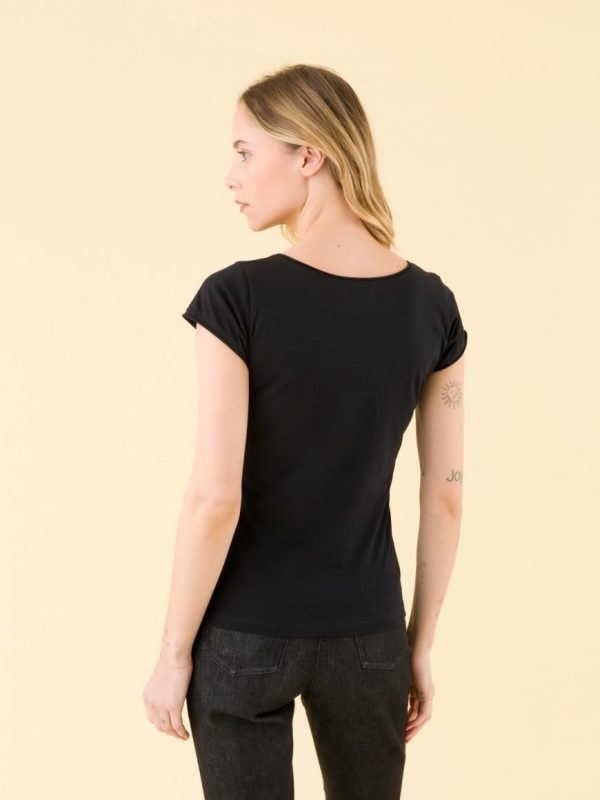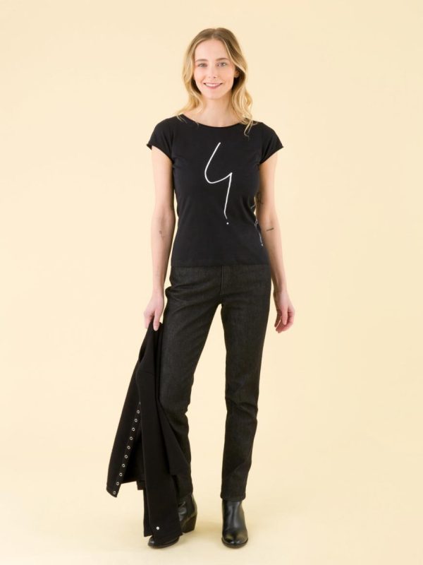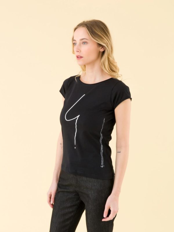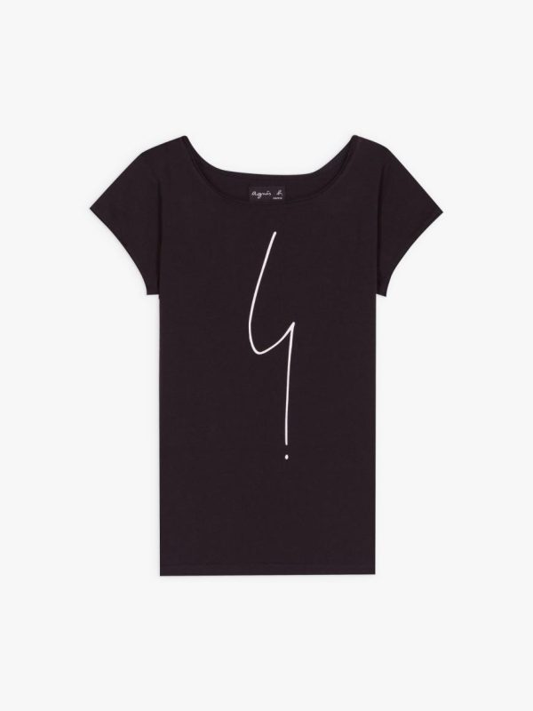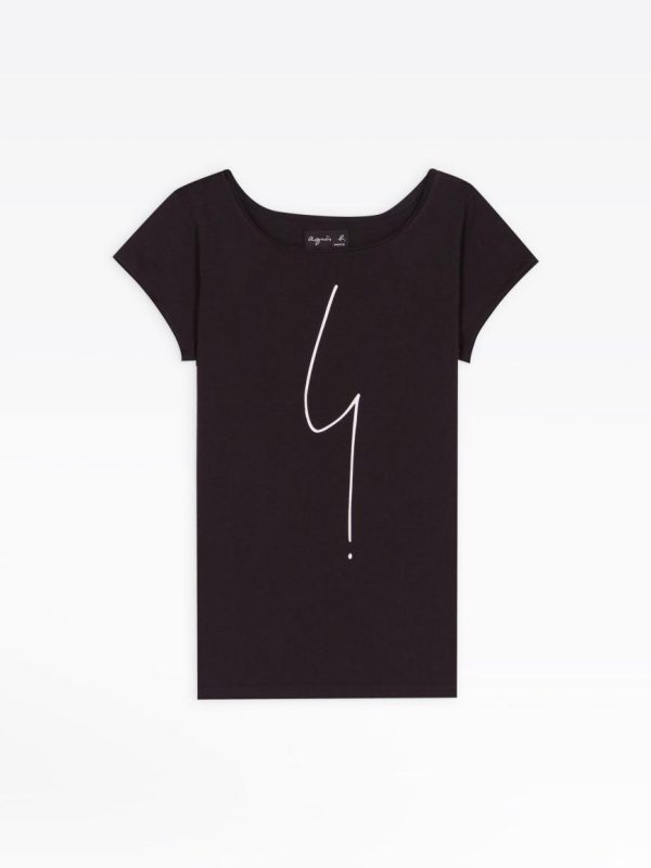 The short-sleeved Australie T-shirt in soft, supple cotton jersey features a screen-printed “irony mark”. It is very feminine with his fitted cut and oval neckline. The irony mark is a punctuation mark invented by a whimsical grammarian and was taken up by agnès b in her contemporary arts magazine.